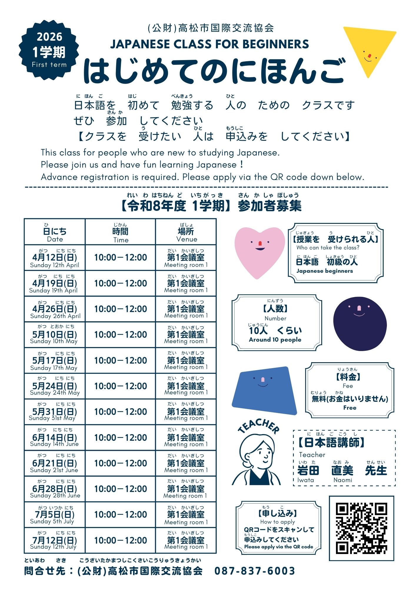 令和8年度はじめてのにほんご【1学期】 参加者(さんかしゃ) 募集(ぼしゅう) (2026/03/08)