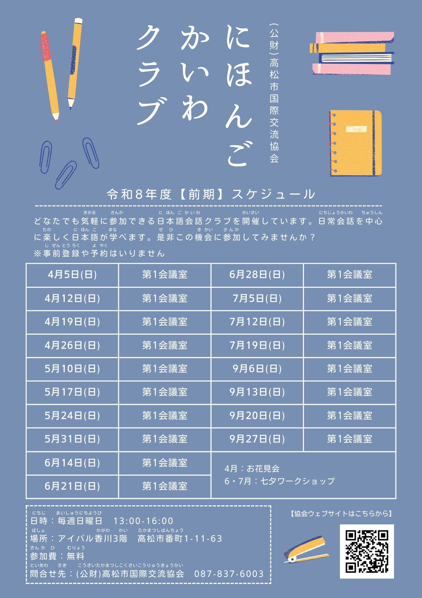 令和8年度日本語会話クラブ【前期スケジュール】 Japanese Conversation Club schedule (Spring-Summer 2026)(2026/03/08)