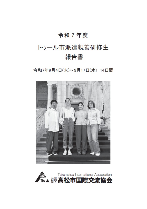 【親善研修生 報告書】令和7年度令和5年度令和元年度平成30年度平成29年度平成28年度平成27年度平成26年度平成25年度平成24年度平成8年度【記念事業】平成30年(2018年) 【高松市・トゥール市姉妹都市提携30周年記念】市民親善訪問団報告書平成20年(2008年) 【高松市・トゥール市姉妹都市提携20周年記念】市民親善使節団訪問報告書平成3年(1991年) 【協会設立1周年記念】市民海外親善使節団報告書