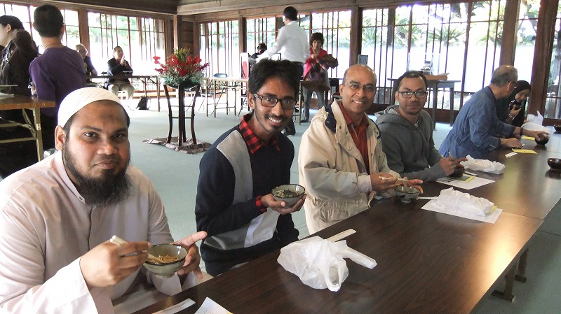 11/5(日)玉藻公園 披雲閣にて恒例の秋のお茶会が開催されました。5ケ国 23人の外国人の方が参加されました。 披雲閣入り口にて 茶席で抹茶と和菓子を楽しみました。 茶そばを頂いております。