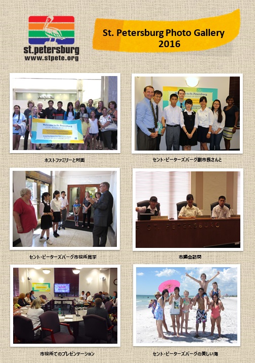 平成28年度セント・ピーターズバーグ市派遣高校生親善研修生が7月24日~8月4日の12日間米国フロリダのセントピーターズバーグを訪問してきましたので写真をアップ致します。